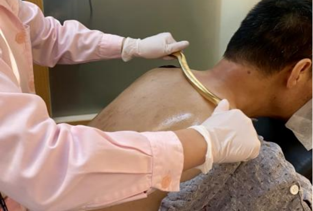 在呼吸道疾病中,喘证是一种临床常见病,主要表现为刺激性干咳,咽痒,无痰或咳少量白稀痰,气候骤变时发病较多。而肺脏通过呼吸道与外界直接相通,“天气通于肺”故肺脏受时令等因素影响更明显。在病房里我们不少咳嗽病友在进行中医药内调的同时也在寻求有效的中医外治法辅助,使疗效最大化。 下面我们来支一个中医外治止咳小妙招——铜砭刮痧。 在中医理论中,人体的经络系统与自然界的时间变化密切相关。人体的气血在一定的时间内流注于十二经脉,调节人体的生理病理活动。肺五行属金,申时(15:00)、酉时(17:00)五行同样属金,而铜砭刮痧作为一种传统的中医疗法,砭的材质黄铜属金,金足生肾水,母强子壮;黄铜还具备抗菌功能,与人体生物电频率相近,产生深度调理。故申时和酉时肺经气血旺盛,肺气充足,借自然之气疏通经络,辅以铜砭化解痰湿,可祛邪外出,减轻病情。 因此在申时(15:00)或酉时(17:00)我们采用纯铜所制刮痧板,刮拭背部膀胱经、前胸任脉、上肢肺经。利用渗透原理,通过血管壁内外的压力差,使已经污糟的血液暂时渗透到管壁外,再由人体内经络系统的推动和自身的溶血功能使之排出体外,调动阳气治病,扶正祛邪。 图1 铜砭刮痧操作示例 具体操作如下: 1.开始时间及部位 于申时(15:00)或酉时(17:00)使用铜砭刮痧板(黄铜所制),蘸取适量刮痧油,开背部四穴,即大椎、大杼、膏肓、神堂。 ①刮拭部位:督脉(风府至命门,重点刮拭风府至身柱)、奇穴(定喘、夹脊)、膀胱经(第一侧线:天柱至肾俞;第二侧线:附分至志室,重点肺、肝、脾、肾投影部位,刮到两胁)、胸腺(任脉:天突至膻中,前胸由内向外刮拭,重点刮拭膻中、中府、心肺投影区)、肺经(天府至少商,重点刮拭尺泽、孔最、列缺、少商)、大肠经(曲池至商阳,重点刮拭曲池)。 ②刮拭顺序:由上到下、由左到右。督脉—夹脊—膀胱经—胸腺—肺经—大肠经—四井。 图2 经络示例 2.手法与时间 顺着骨骼肌肉走向进行,将皮肤刮红、直至出痧为止,不可强行出痧,刮痧力度以患者舒适为宜,观察患者治疗过程中的反应。刮拭时间40~50min,每个穴位重点刮30s。 3.注意事项 禁忌人群:皮肤破损、凝血障碍、孕妇、体虚者不宜刮痧。咳嗽伴高热、咯血时需及时就医,不可自行刮痧。 4.操作后护理 刮痧后避风寒,饮温水促进代谢。刮痧间隔3-7天,待痧退后再进行下一次。 温馨提示: 刮痧需辨证操作,若咳嗽持续超过1周、痰中带血或伴胸痛,请及时就医排查病因。■ 参考文献 [1]张晓琪.邢亚情,佘延芬,等.刮痧治疗感冒后咳嗽随机对照临床研究[J].河北中医药学报,2017.32(5):32. [2]韩莉,陈玲,刘芳,等.铜砭刮痧循经取穴疗法治疗风寒袭肺型咳嗽疗效观察[J].新疆中医药,2020,(38)3:33-36. [3]王丽梅.多经络联合刮痧治疗风热犯表型感冒疗效观察[J].中国城乡企业卫生,2018,2(2):19.